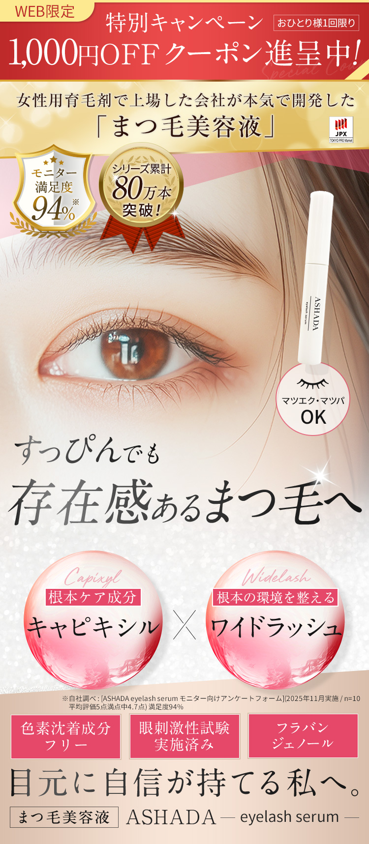 ASHADAのまつ毛美容液は色素沈着を起こすと考えられる成分は含まれておりませんので、ご安心ください。